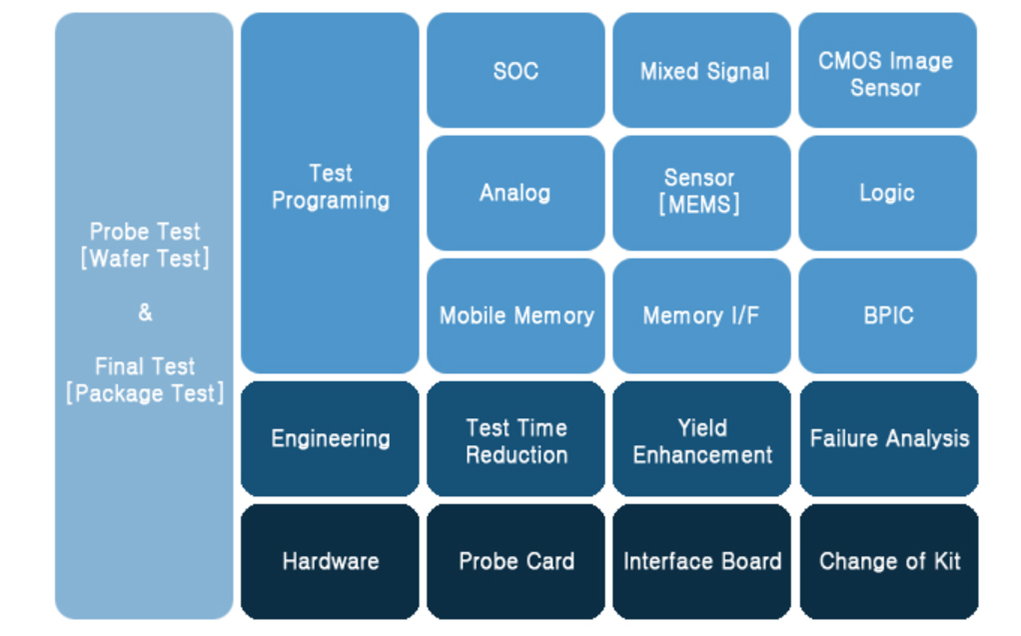 또한 당사는 고객사의 제품을 신속 정확하게 테스트 하기 위해 디바이스의 특성을 확인할 수 있는 자체 테스트 프로그램을 개발하고, 대량생산에 따른 지속적인 엔지니어링을 통하여 테스트 시간 절감, 수율 개선 등을 제공합니다.