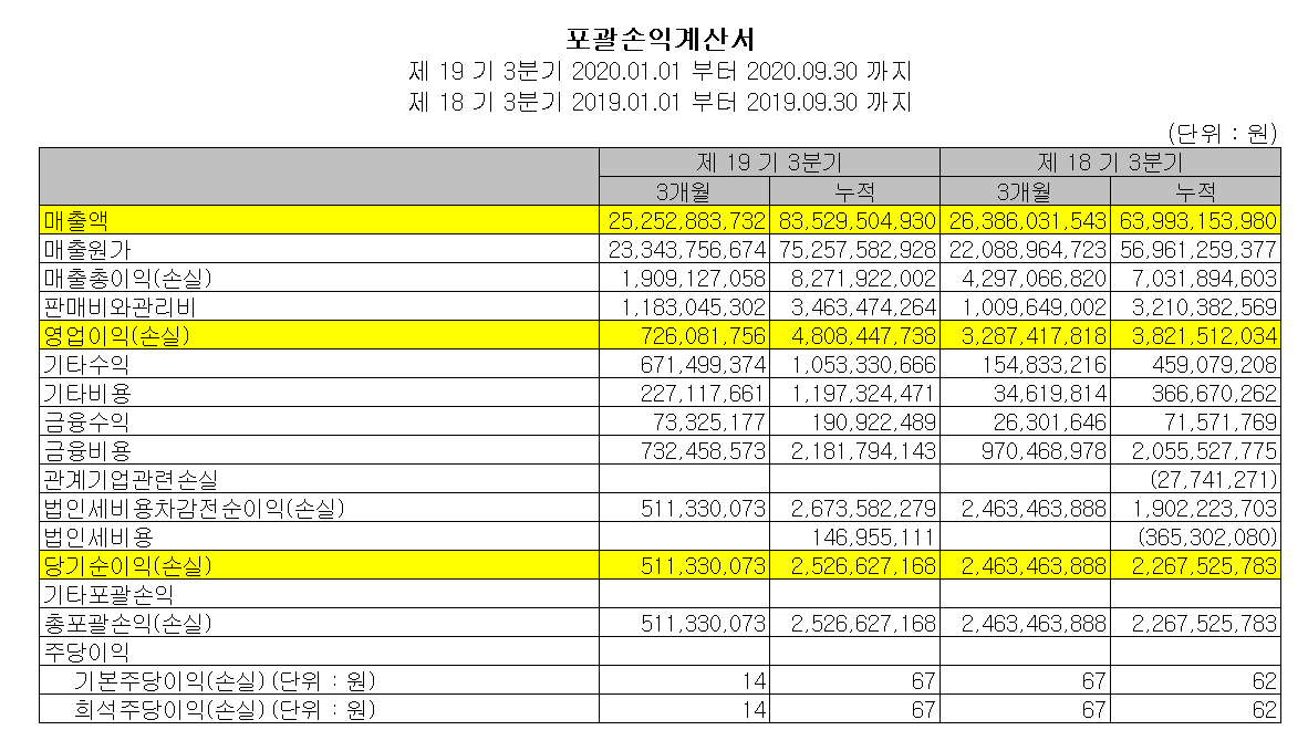 당사의 2020년 3분기 누적 기준 매출액은 835억 원으로 전년 동기 대비 30.5% 증가했고, 영업이익은 당분기 감소했으나 누적 기준으로 25.8% 증가했습니다.