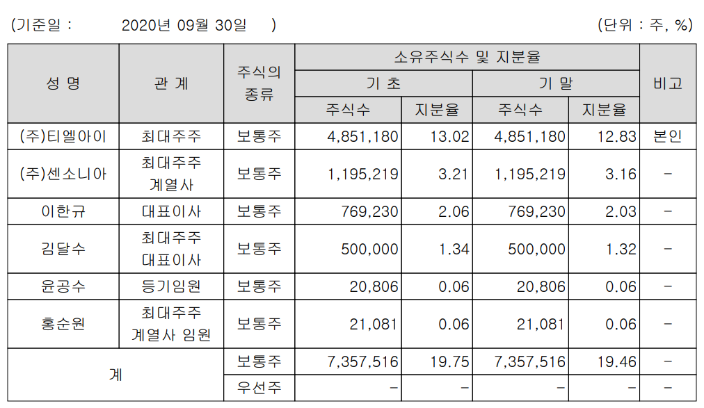 당사의 최대 주주는 (주)티엘아이로 12.83%의 지분을 소유하고 있습니다. 티엘아이는 반도체 소자의 설계, 제조 및 판매를 목적으로 하는 Fabless 기업입니다.