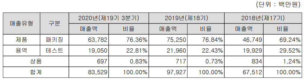 지난 2020년 3분기 기준 반도체 패키징 사업 부문 매출이 638억 원으로 전체 매출의 76.36%, 테스트 부문이 190억 원으로 22.81%를 차지하였습니다. SSD 등 스토리지 계열 상품 매출은 7억 원으로 0.83%입니다.