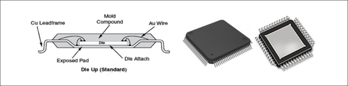 QFP 방식은 그림과 같이 SMD(Surface Mount Device) 타입의 반도체 칩과 칩의 4면이 갈매기 날개와 같은 형태의 리드 프레임으로 구성되는 패키지 방식입니다. Analog, ASIC, DSP, PLD, Sensors, Micro-Controllers 등에 많이 사용됩니다.
