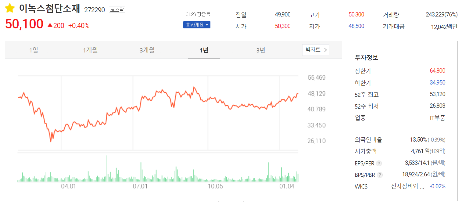 당사는 1월 26일 장 종료 기준 50,100원으로 거래되었으며, 외국인 비중은 13.50%입니다.