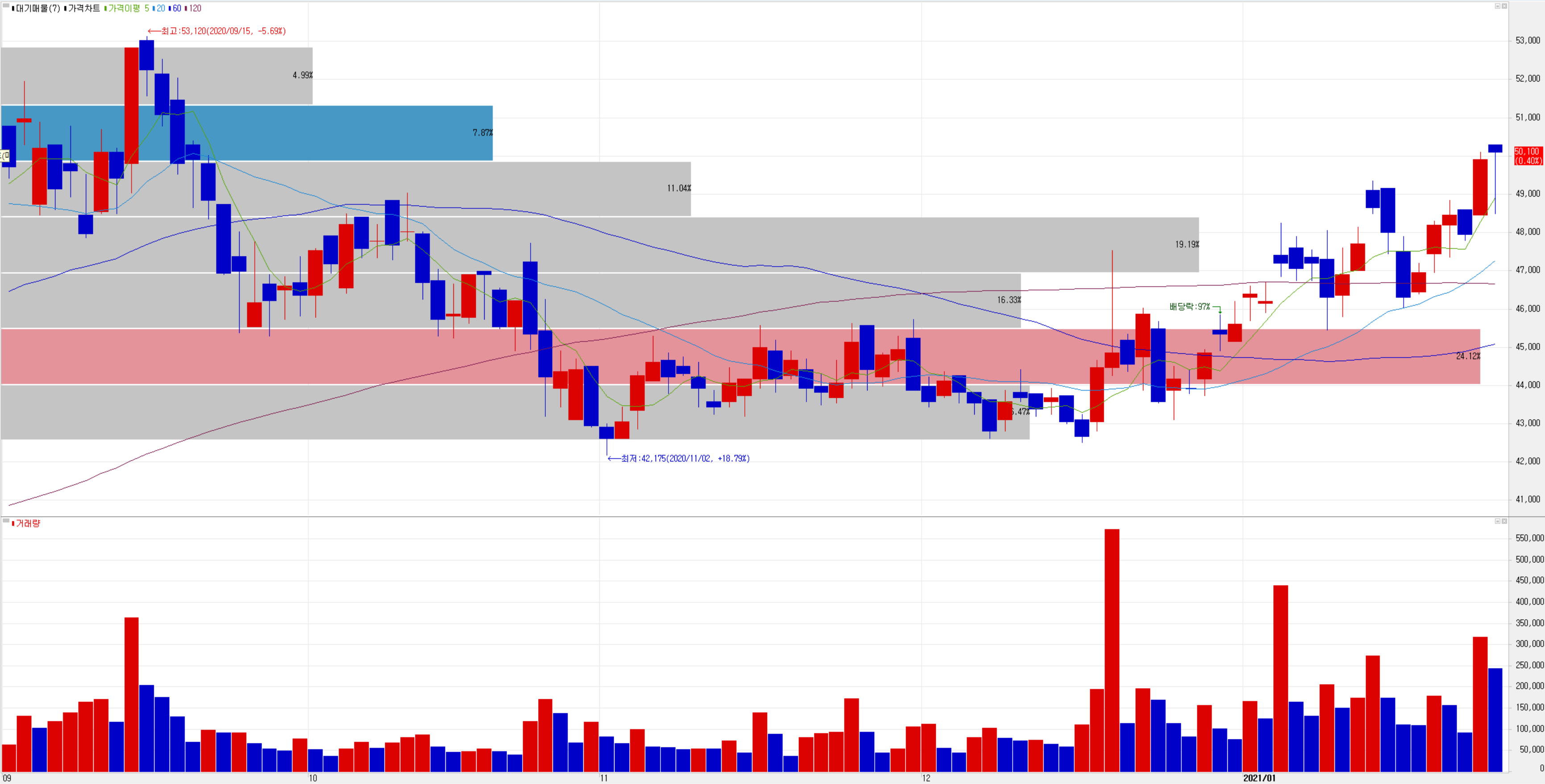 오늘은 주가는 5일선을 깨면서 하방 지지를 확인하고 강보합에 마감했습니다. 최근 수급에서는 각 주체별 공방이 치열한 가운데 손바뀜이 잦아 보입니다. 차트상 추세는 유효한 것으로 판단됩니다. 중장기 보유 예상 종목이라서 46,000~49,000원에서 일부 매집을 시작했고, 중장기 목표 가격은 65,000원으로 추가 하락 시 비중을 늘일 예정입니다.