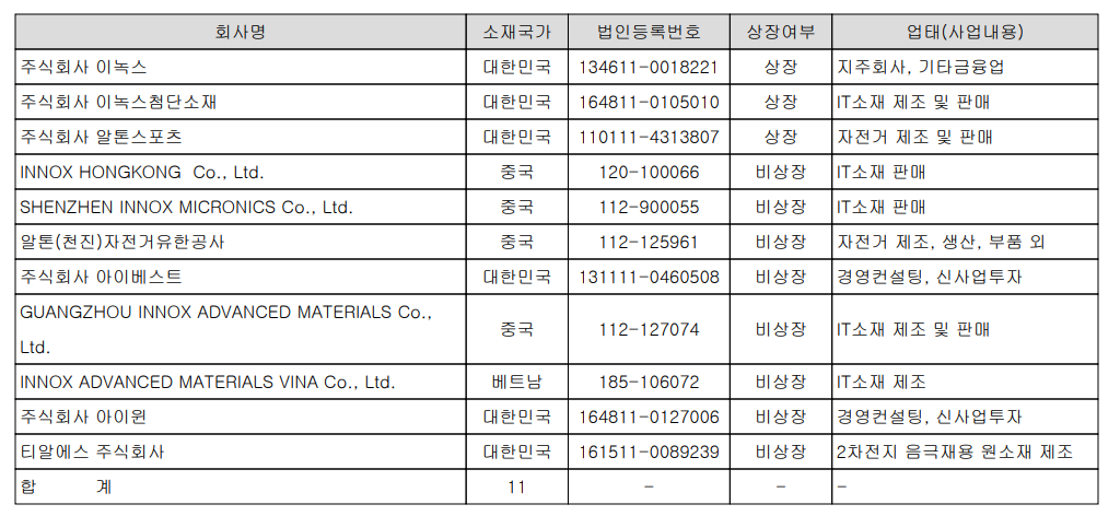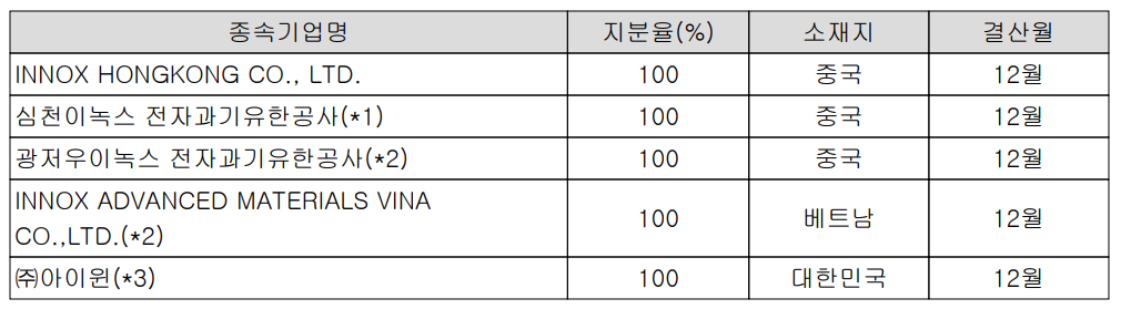 당사는 2020년 3분기 말 현재 5개의 종속회사를 보유하고 있습니다. 이중 광저우와 베트남 현지 법인은 2018년 해외 사업 확대 및 생산 거점 확보를 목적으로 설립되었습니다. 또한 당사는 2017년 6월 (주)이녹스로부터 분할 신설되면서 (주)이녹스가 당사의 최대주주입니다.