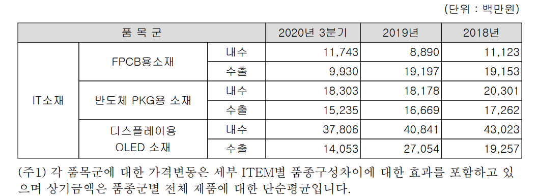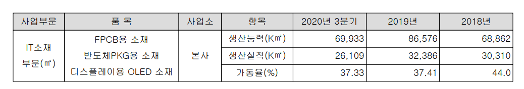 2020년 3분기 기준 FPCB용 매출은 1141억 원으로 당사 전체 매출의 45.49%를 차지하며, OLED 관련 소재의 매출이 1103억 원으로 43.98% 그리고 반도체 패키지용 소재가 264억 원으로 10.53%를 차지하고 있습니다.