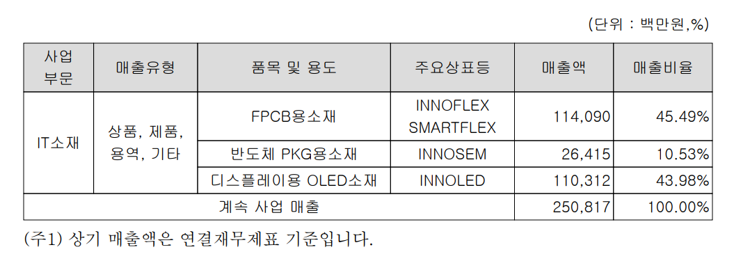 당사의 회로소재 관련한 사업은 주로 연성회로기판(FPCB, Flexible Printed Circuit Board)에 사용된 소재로써 INNOFLEX라는 브랜드로 공급되는 제품군과 기능성 소재로 공급되는 SMARTFLEX 브랜드로 공급되고 있습니다.