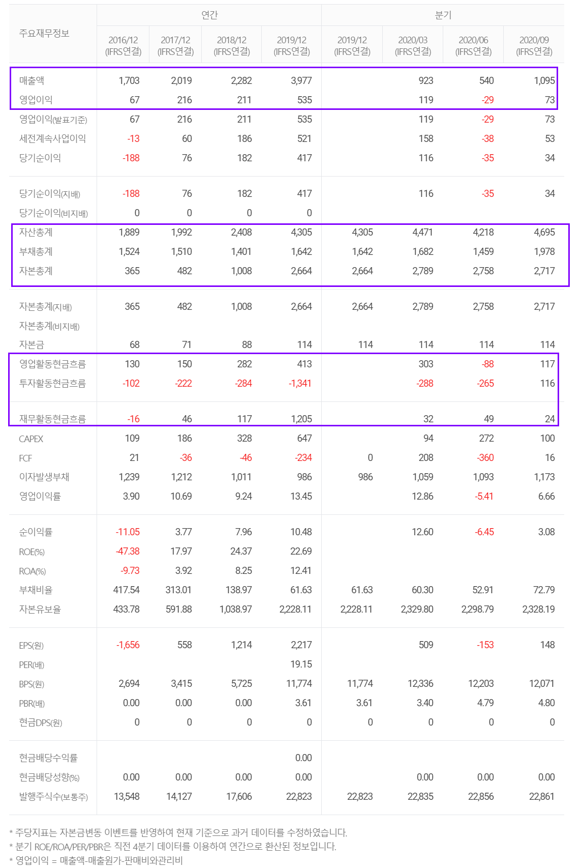 증설에 따른 자산이 증가했고, 영업 활동으로 인한 현금 창출은 개선되었으며, 2020년 12월 부터 베트남 공장 증설 등을 앞두고 있습니다.