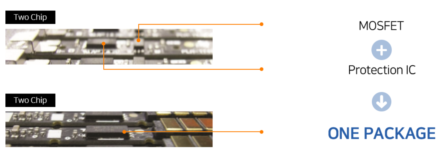 당사는 세계 최초로 보호회로의 각 소자를 하나의 올인원(All-in-one) 패키지로 구현하여, 기존 2차전지 보호회로인 PCM(Protection Circuit Module)을 완벽하게 대체함으로써 기존 제품 대비 전기저항을 줄이고, 소형화 및 내장화를 통해 물리적 전기적 보호 성능과 신뢰성을 향상한 제품입니다.