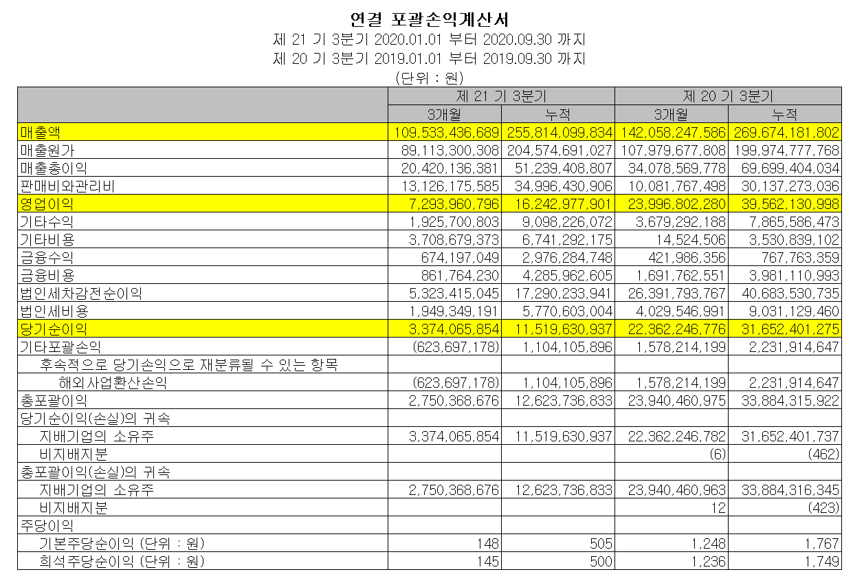 당사의 2020년 3분기 매출액은 2558억 원으로 전년 동기 대비 5.1% 감소, 영업이익은 162억 원으로 58.9% 감소했습니다. 코로나 19로 인한 매출 부진에 따른 고정비 부담이 감소 요인으로 보입니다.