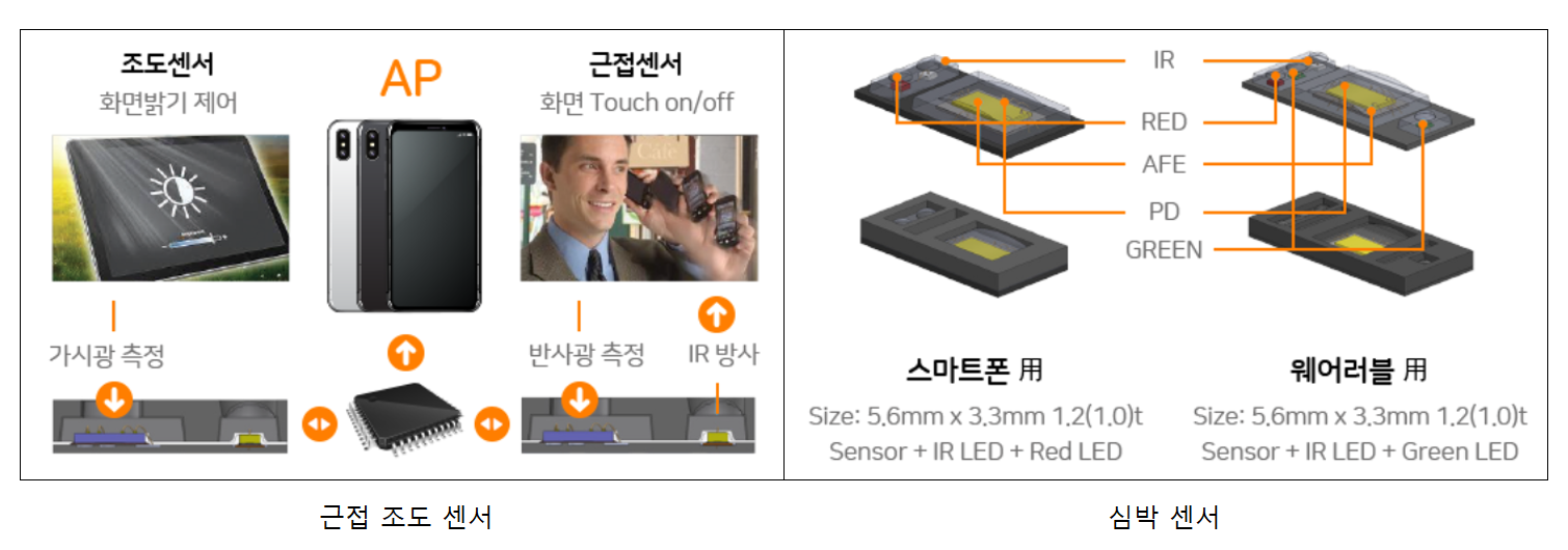 센서에는 다양한 광원을 감지하는 광센서 제품과 심박 센서 등을 개발, 공급하고 있습니다.