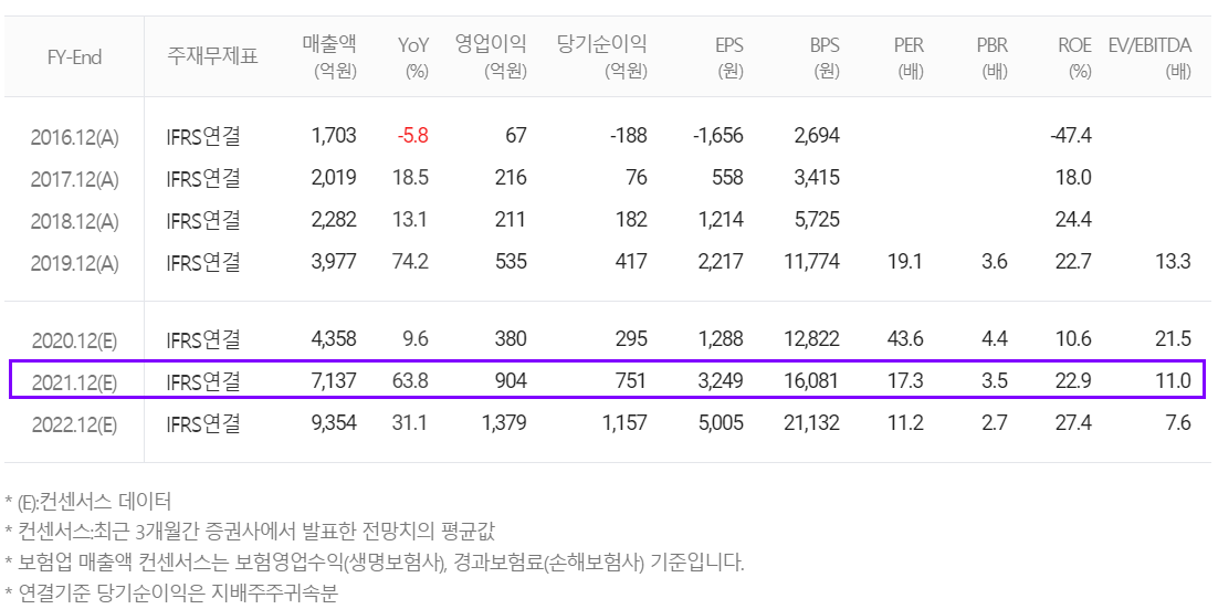 2020년 4분기 매출이 1,800억 원으로 분기 및 연매출 사상 최대를 추정했고, 2021년 매출은 7,137억 원으로 전년 대비 63.8% 증가, 영업이익 904억 원으로 138% 증가하는 것으로 추정했습니다.