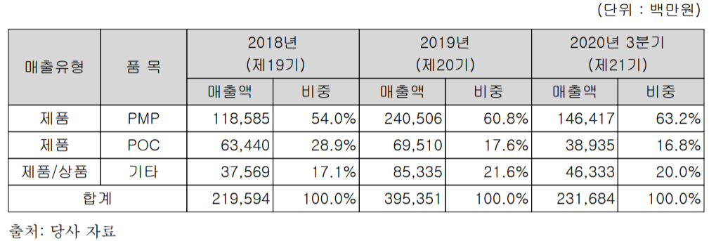 당사의 주요 제품별 매출 구조를 보면 PMP 부문이 전체 매출의 63.2%로 가장 큰 매출원이며, POC가 16.8%를 차지하고 있습니다.