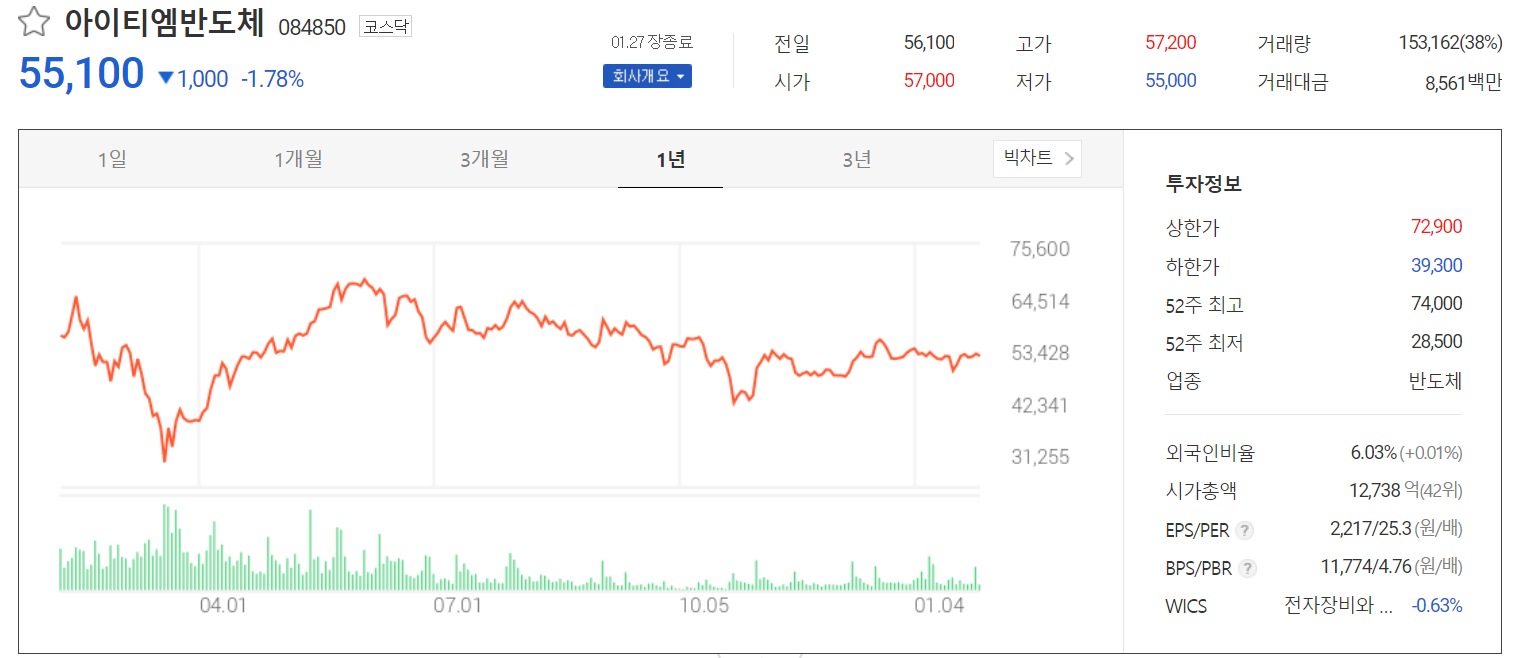 1월 27일 장종료 기준 1.78% 내린 55,100원에 거래를 마쳤습니다. 코스닥 지수가 1,000포인트를 테스트하면서 0.81% 내린 채로 마감되었습니다. 외국인 비중은 6.03%이고, 시가총액은 1조 2738억 원으로 코스닥 42위 종목입니다.