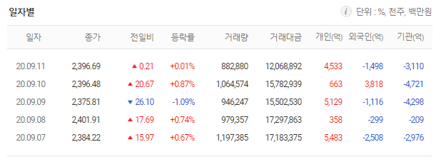 지난주 코스피는 전 주 금요일 장 마감 (2,368.25) 보다 28.44(1.19%) 포인트 오른 2396.69로 마감했습니다.