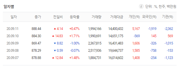 지난 주 코스피 일자별 상황 (자료: 다음)