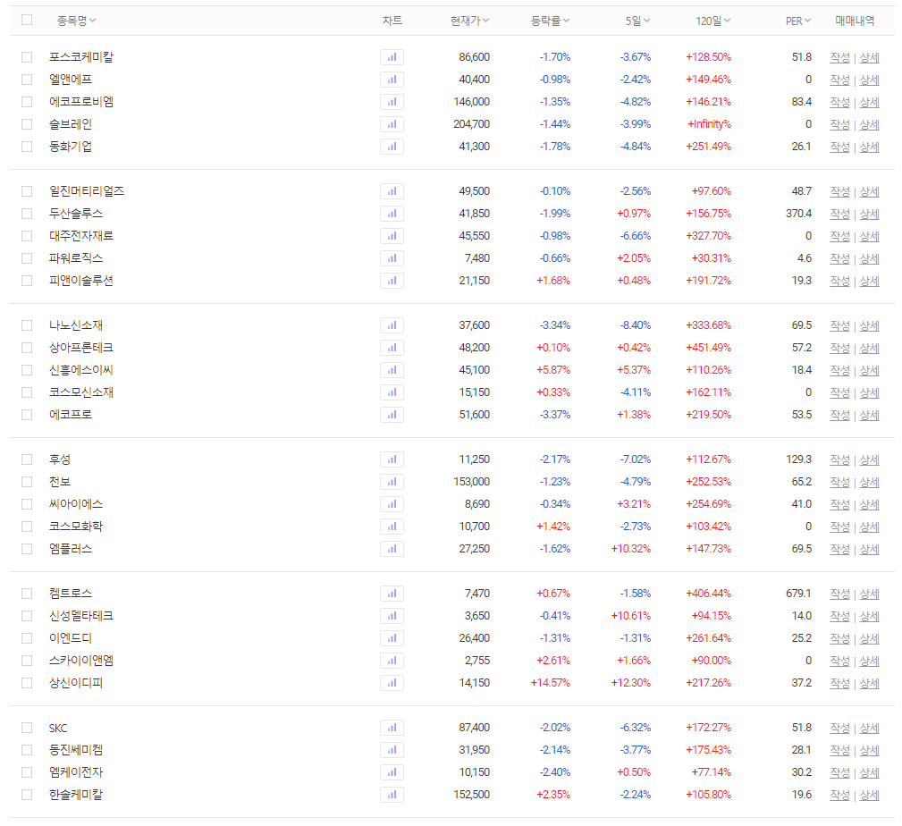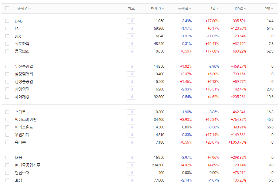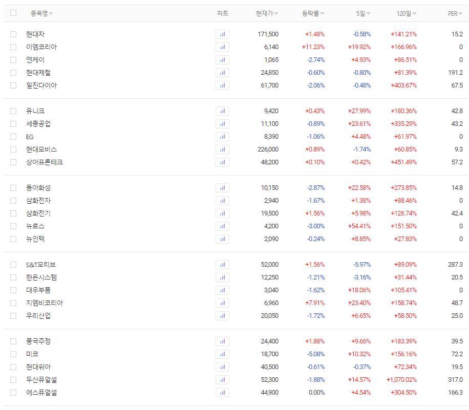 그리고 유니크, 세종공업, 동아화성, 뉴로스, 대우부품 및 지엠비코리아 등이 크게 오르면서 K-뉴딜 수소차 관련 종목들이 크게 올랐습니다. 지난 120 거래일 간 엄청난 상승을 보여주고 있는 수소차 종목들이 어디까지 그 힘을 이어갈지 기대됩니다.