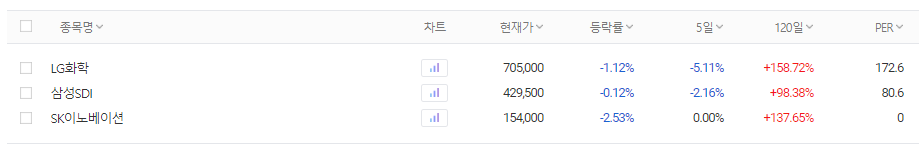 지난주 전기차 배터리 3사의 경우 테슬라 주가 하락의 영향 등으로 LG화학 및 삼성SDI 는 각각 5.11%, 2.16% 하락했습니다.