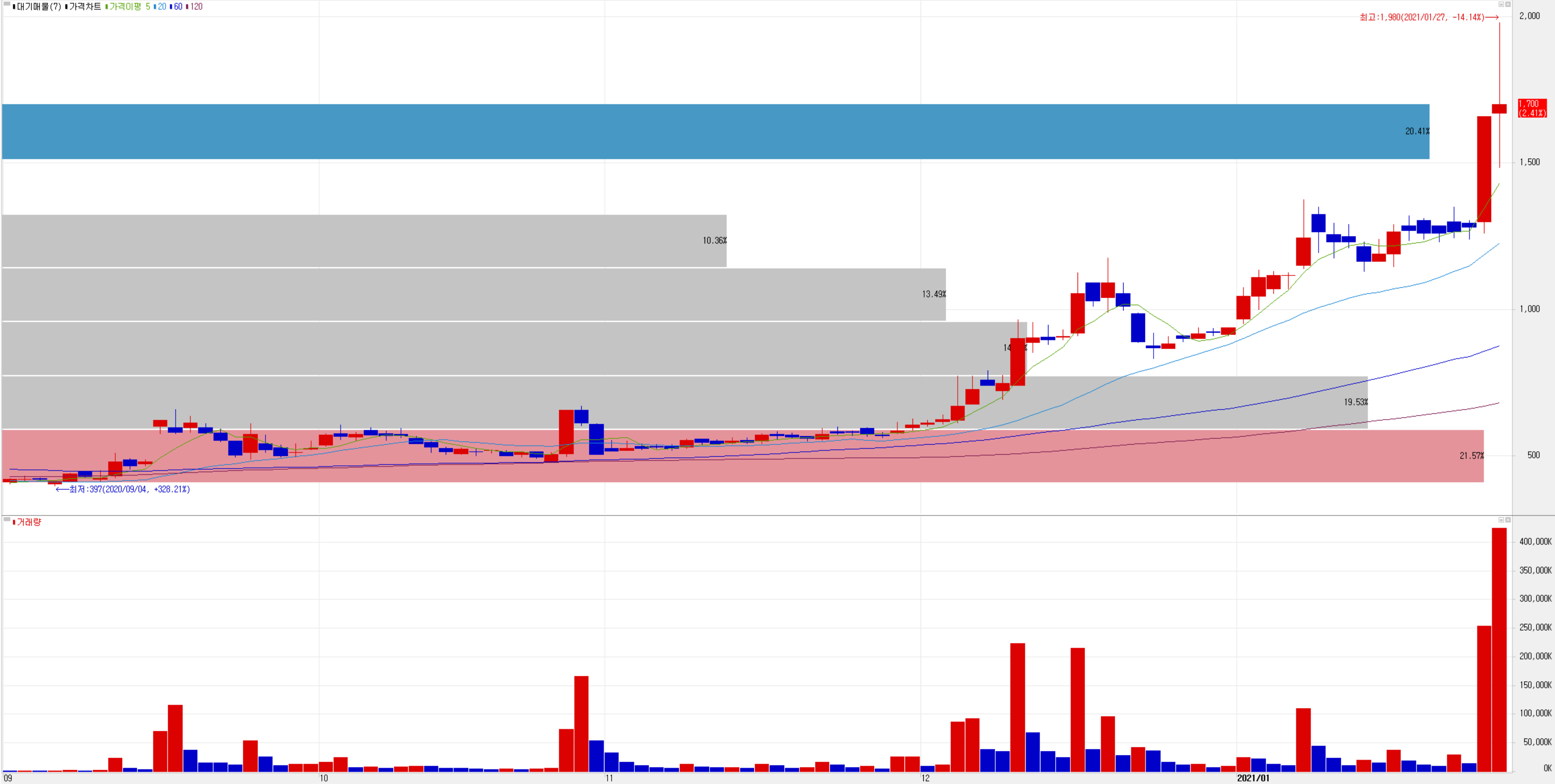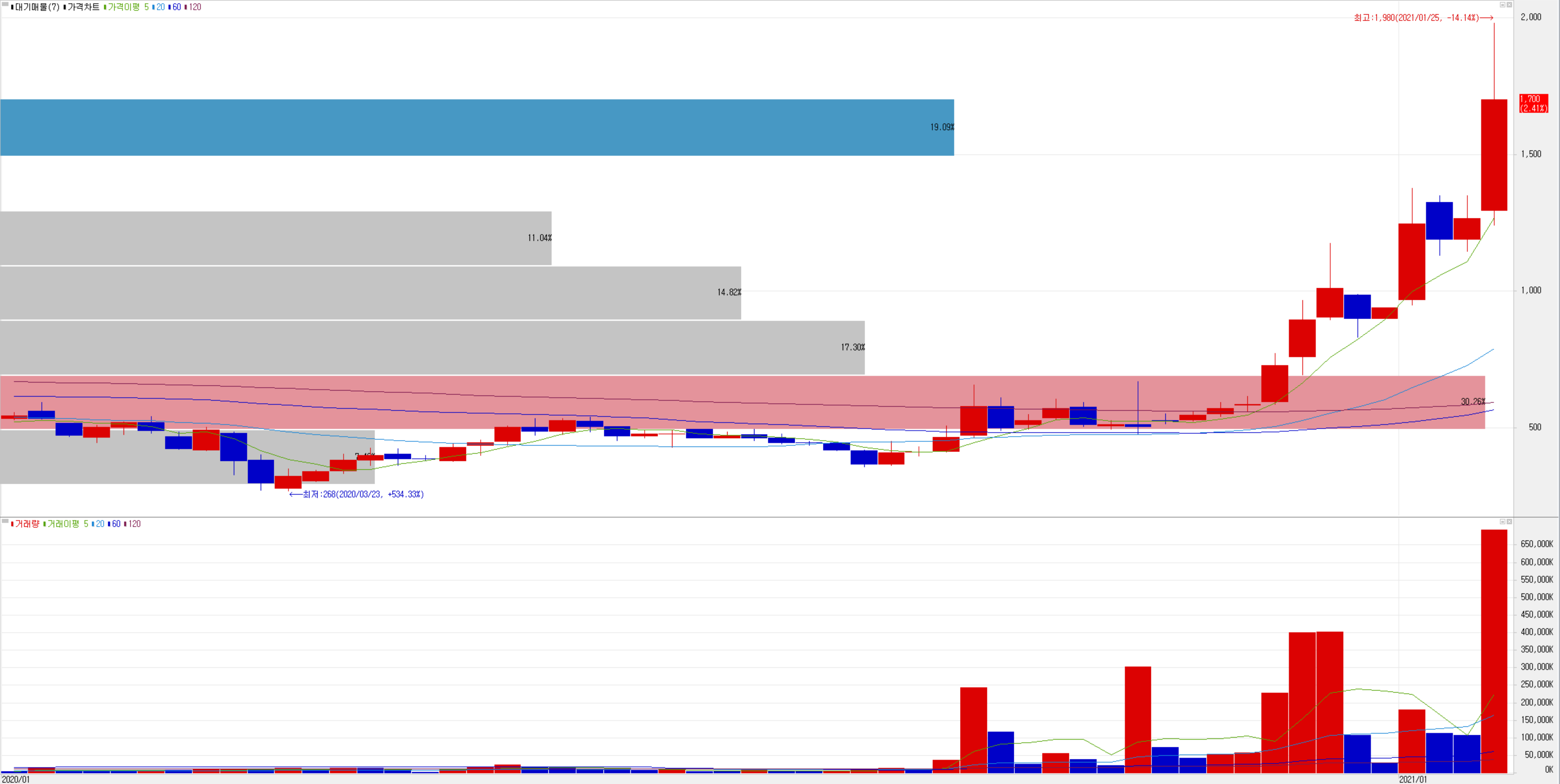 1월 26일 외국인의 매수에 장대 양봉이 나오면서 상한가를 기록했고 거래량도 무려 발행 주식의 2배 가까운 4억 주가 거래되었습니다. 27일도 기관과 개인의 매수에 좋은 흐름을 이어갔습니다. 이평선 정배열 상태로 상승추세에 있으나, 단기 급등에 따른 차익 매물 등과 치열한 수급 공방이 예상됩니다. 지난 26일 개인적은 저항선인 1350원을 돌파하면 진입하려 했으나 타이밍을 놓치고 말았습니다. 오늘 일봉이 도지형으로 끝나서 조금 지켜봐야겠으나, 거래량으로 볼 때 시장 전체의 조정이 없는 한 추세 이탈을 염두에 두지는 않습니다. 수급을 확인하면서 단기적으로는 1,300 ~ 2,200원으로 넓게 보고 접근하지만, 조정 시 중장기 보유할 예정입니다.