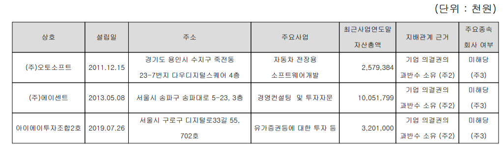 당사의 종속회사로는 3개가 있으며, 자동차 전장용 소프트웨어 개발을 영위하는 오토소프트와 경영컨설팅 및 투자자문 등을 목적으로 하는 에이센트 및 아이에이투자조합2호가 있습니다.