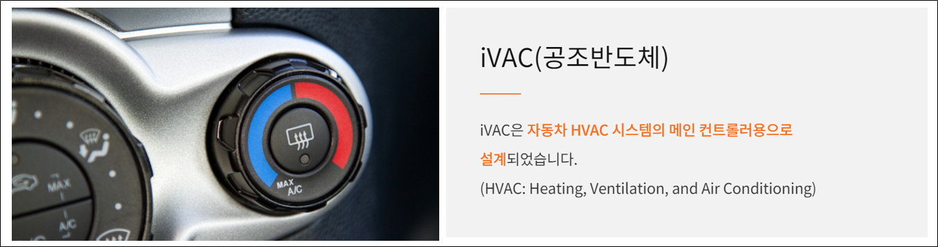 iVAC은 자동차 HVAC 시스템의 메인 컨트롤러용으로 설계되었습니다.(HVAC: Heating, Ventilation, and Air Conditioning)
