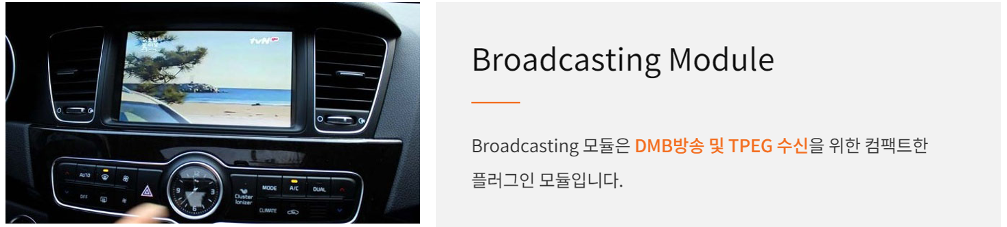 Broadcasting 모듈은 DMB 방송 및 TPEG 수신을 위한 콤팩트한 플러그인 모듈입니다.