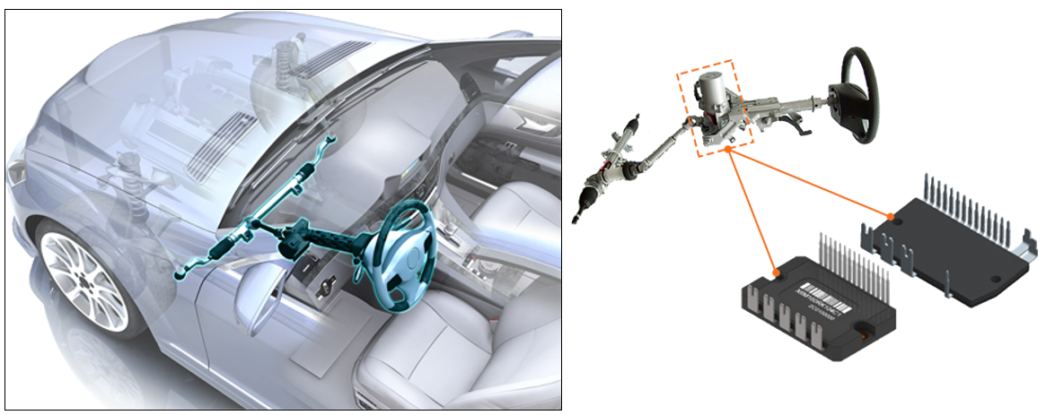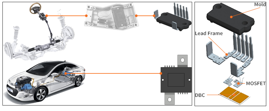 EPS의 모터 제어 성능의 향상을 위한3상 MOSFET 모듈로 온도 및 전류 센서 등이 집적화된 제품입니다