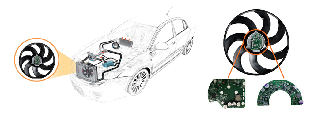 팬과 통합 패키지로써 모터 위치 센서 없이 위치 및 속도의 정밀한 제어를 위한 알고리즘을 적용하여 고효율, 저소음을 구현한 제품입니다.