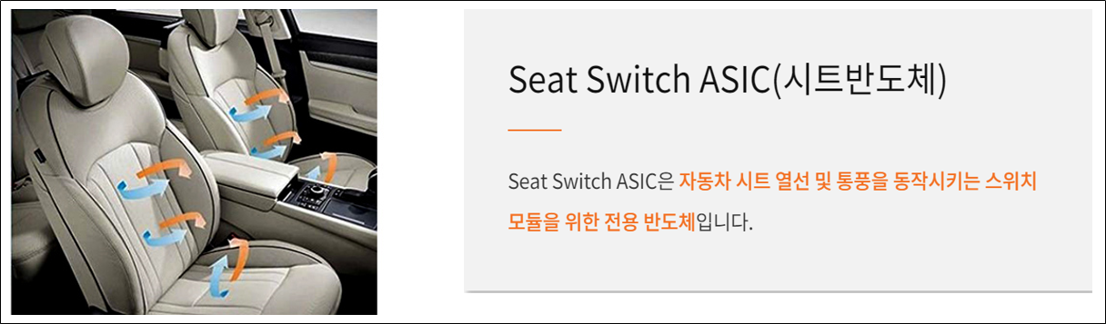 Seat Switch ASIC은 자동차 시트 열선 및 통풍을 동작시키는 스위치 모듈을 위한 전용 반도체입니다.