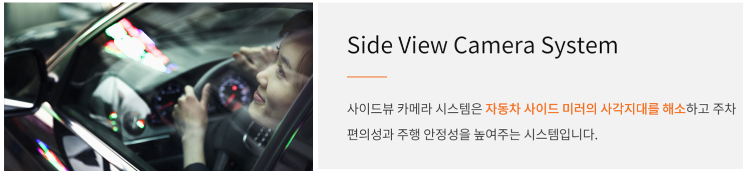 사이드뷰 카메라 시스템은 자동차 사이드 미러의 사각지대를 해소하고 주차 편의성과 주행 안정성을 높여주는 시스템입니다.