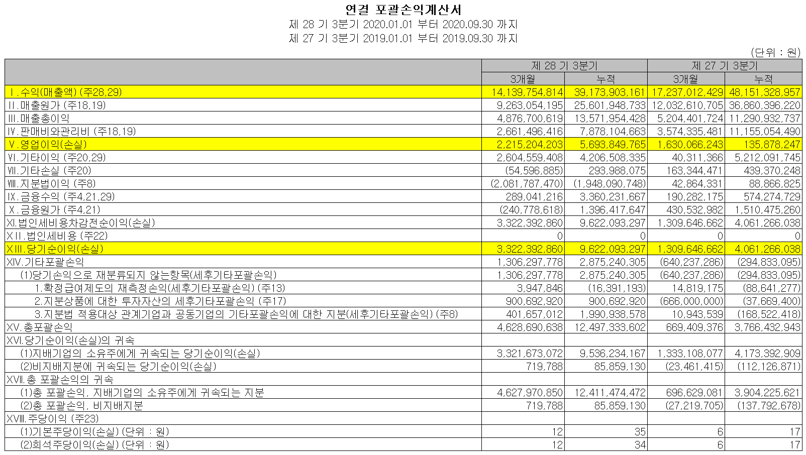 당사의 2020년 3분기 누적 기준 매출액은 392억 원으로 전년 동기 대비 18.6% 감소했고, 영업이익은 57억 원을 기록하면서 전년 대비 4110% 증가했습니다. 당기 순이익은 128.5% 증가했습니다.
