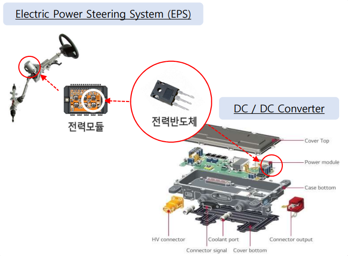 파워 스티어링에 들어가는 전력 모듈 내의 전력반도체는 계열사인 트리노테크놀로지에 의해 국산화에 성공한 제품으로써 실리콘 카바이드(SiC) 계열의 반도체 소자입니다. 기존의 실리콘(Si) 보다 에너지 손실을 최대 90%까지 줄일 수 있으며 변환 효율성이 우수한 것으로 알려졌습니다. 2020년 3분기 현재 제품에 대한 공급을 추진하고 있어 향후 주요 매출원이 될 것으로 기대됩니다.