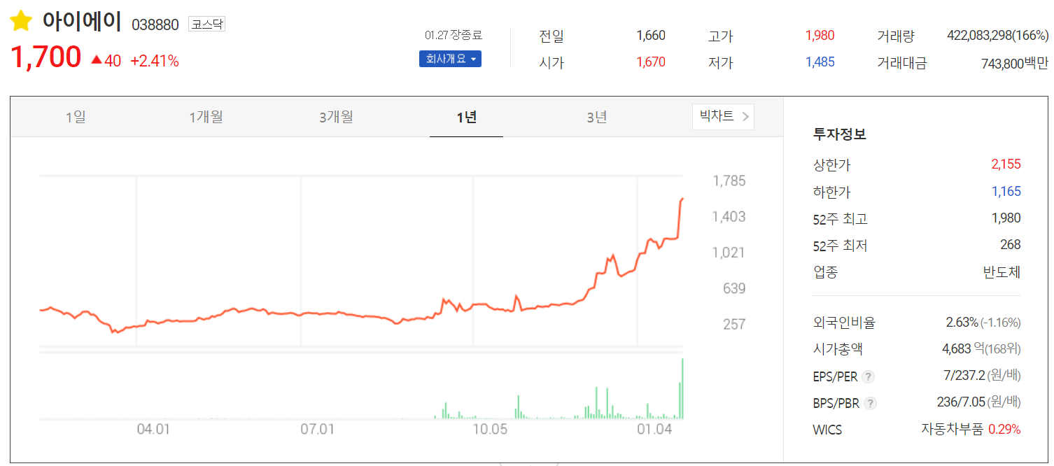 2021년 1월 27일 장 종료 기준 종가 1,700원에 거래를 마쳤습니다.