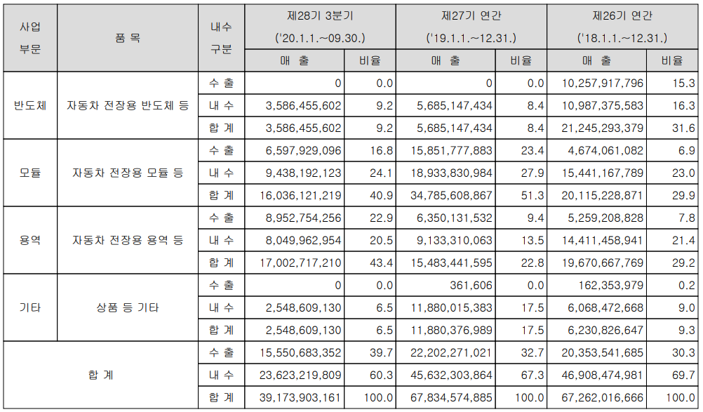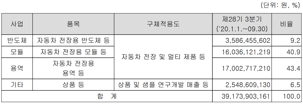 2020년 3분기 기준 매충에서 자동차 전장에 관한 용역이 43.4%, 전장용 모듈이 40.9% 및 자동차 전장용 반도체 매출이 9.2% 등의 비중을 기록했습니다.