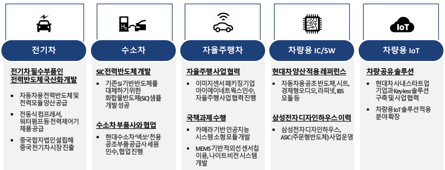 전반적으로 당사 및 주요 계열사의 주요 사업은 전기차, 수소차 및 자율주행차 등에 사용되는 전력 모듈과 전력 반도체를 설계, 개발 및 공급하는 기업입니다.