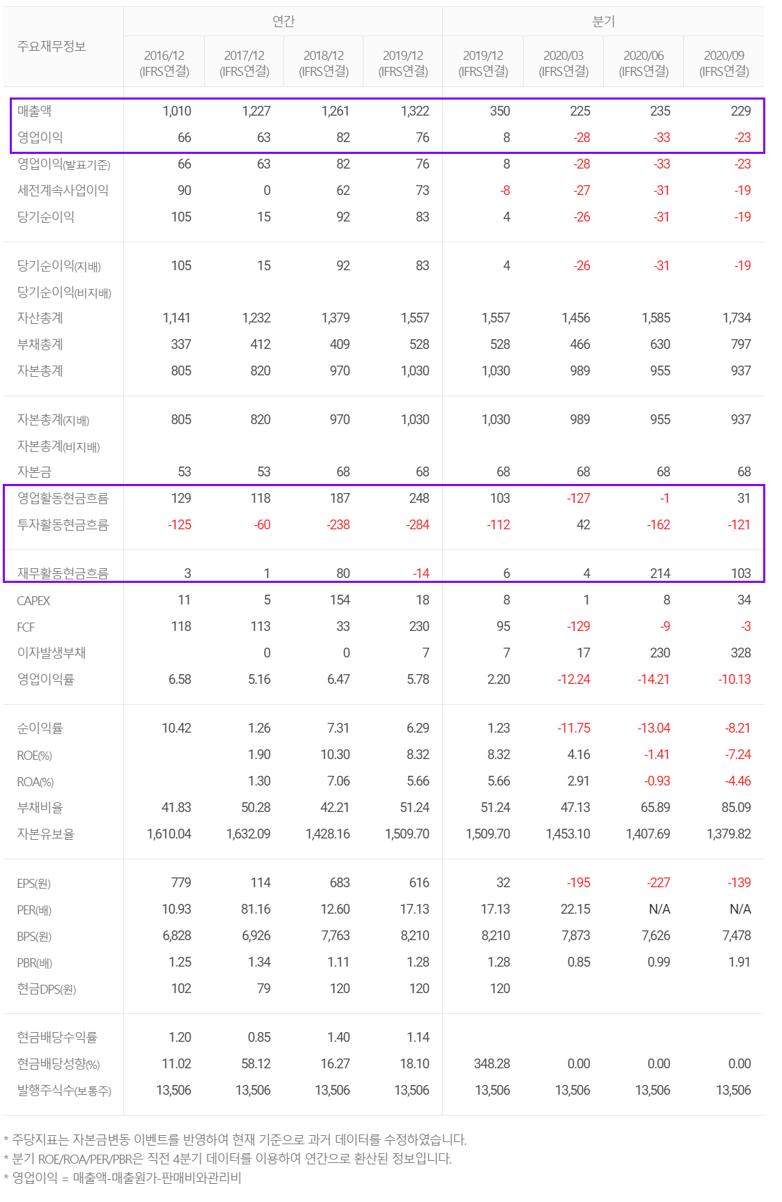 당사의 2020년 3분기 누적 기준 매출액은 689억 원으로 전년 동기 대비 29% 감소했고, 영업이익은 적자전환했습니다. 코로나19 영향으로 주요 고객의 중국 공장 셧다운 및 생산 가동 축소로 인한 매출 감소가 주원인으로 예상됩니다.
