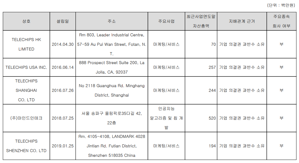 당사는 미국, 홍콩, 상해 및 심천 등에 마케팅과 서비스를 목적으로 하는 현지법인이 있으며, 인공지능 관련 알고리즘과 칩을 개발하는 마인드테크가 종속회사로 있습니다. 또한 Video codec IP 개발 및 라이센싱을 주요 사업으로 하는 (주)칩스앤미디어를 계열회사로 두고 있습니다.