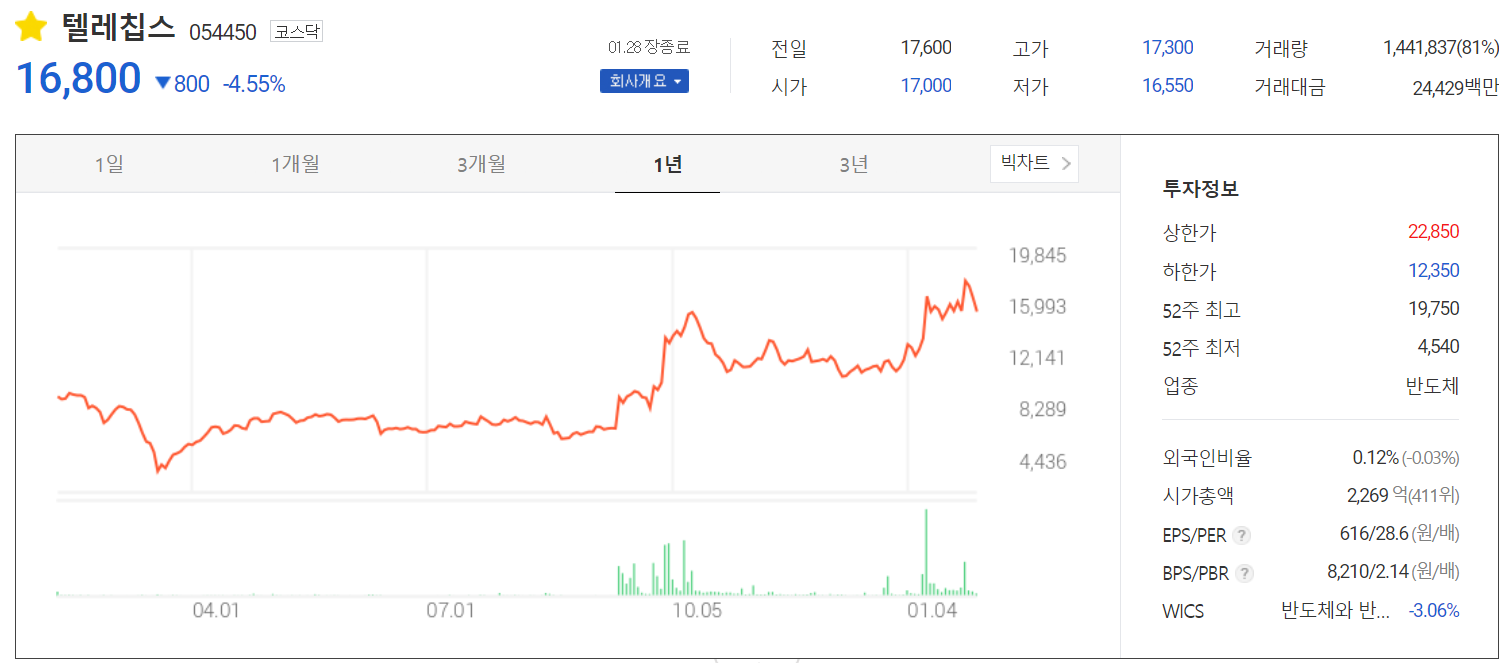 1월 28일 갭하락 출발하면서 텔레칩스뿐만 아니라 많은 업종들이 상당 폭의 조정을 받았습니다. 차트상으로도 1월 27일 하락 장악형 캔들 비슷한 형상을 만들더니, 4%가 넘는 조정이 왔네요. 이평선 기준 어제의 하락이 5일선을 완벽하게 깨트렸고, 내일 추가 조정 시 16,000원 선을 지지하는지를 봐야 추세를 알 것 같습니다만, 차트보다는 시장의 분위기에 따른 수급에 많이 좌우되는 형국이라 차트 분석도 밸류에이션도 어려운 요즘입니다.