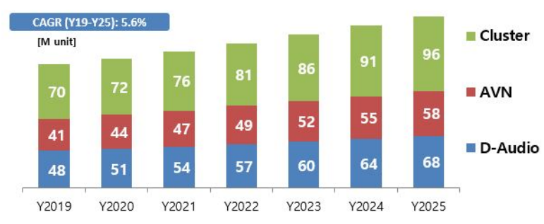 당사의 보고서에 따르면 오토모티브 솔루션 분야(AVN, Digital cluster, D-Audio)의 시장 규모는 2025년까지 연평균 5.6% 정도 성장할 것으로 전망하고 있습니다.