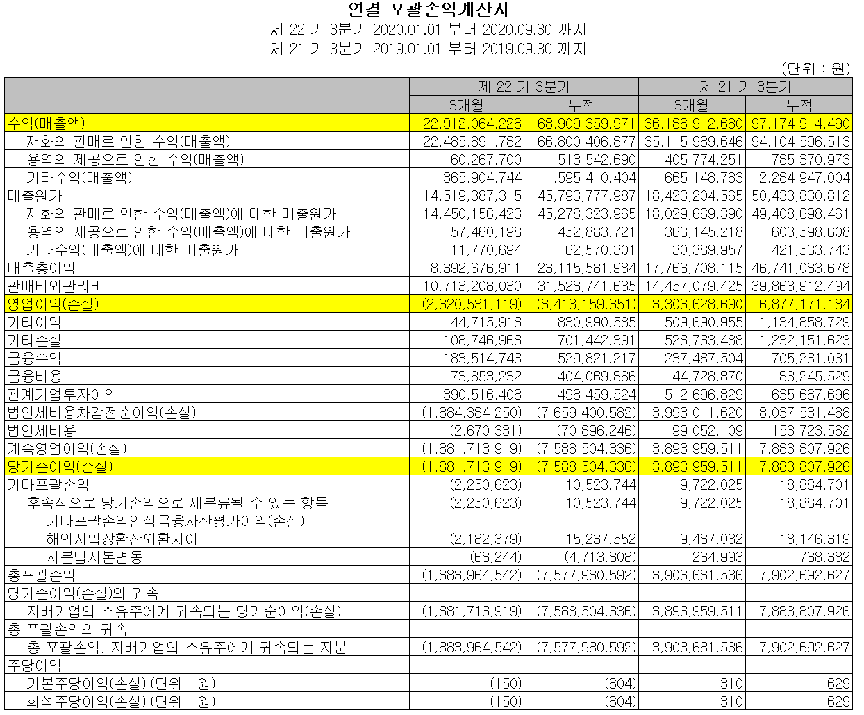 당사의 2020년 3분기 누적 기준 매출액은 689억 원으로 전년 동기 대비 29% 감소했고, 영업이익은 적자전환했습니다. 코로나19 영향으로 주요 고객의 중국 공장 셧다운 및 생산 가동 축소로 인한 매출 감소가 주원인으로 예상됩니다.