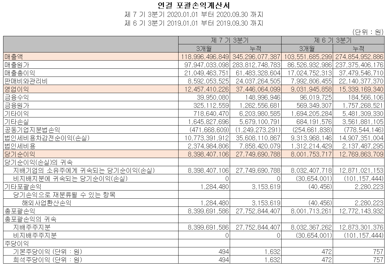 당사의 2020년 3분기 누적 기준 매출액은 3453억 원으로 저년 동기 대비 25.6% 증가했고, 영업이익은 374억 원으로 144% 증가했습니다. 서버용 DRAM 수요가 큰 폭으로 증가하면서 패키징 기판 매출 및 자동차 전장용 리드 프레임 매출의 회복이 견조한 실적을 보여 준 것 같습니다.