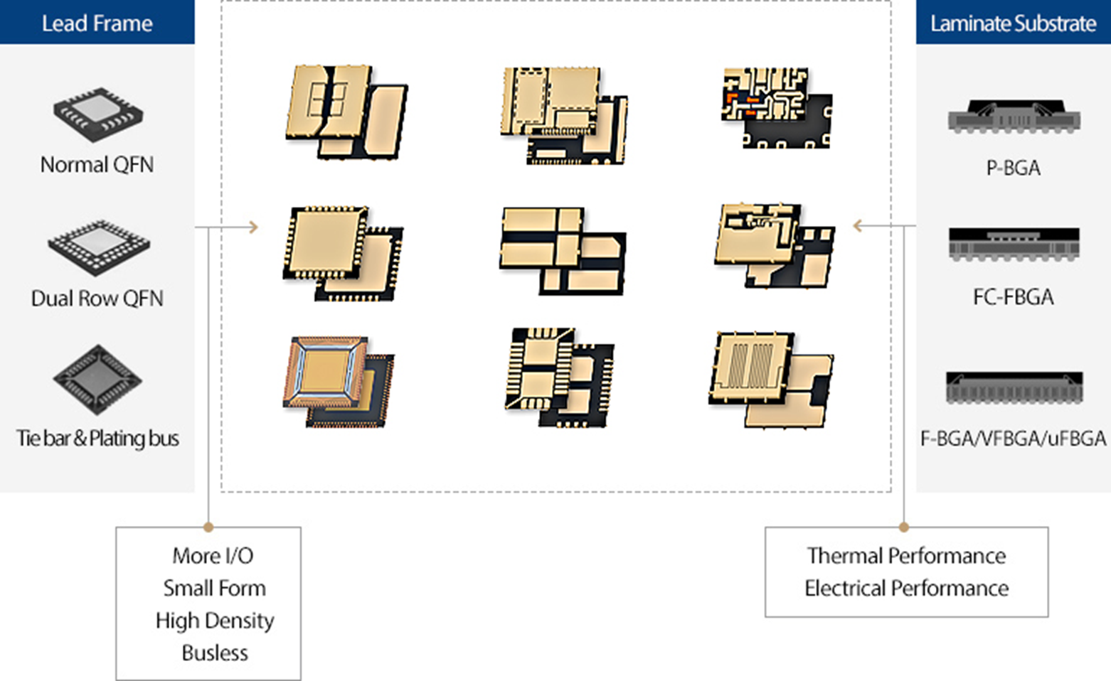 QFN(Qua Flat No-Lead)은 반도체 칩의 패키징 기술이며, 당사의 연구 개발로 만들어진 Routable-QFN은 반도체 패키지의 소형화 기술로써 더 많은 Row(최대 4 row)와 I/O(최대 400 pin)까지 구현이 가능합니다. 또한 해당 제품은 Lead Frame과 Package Substrate의 장점을 모두 갖춘 차세대 기판 구조입니다.