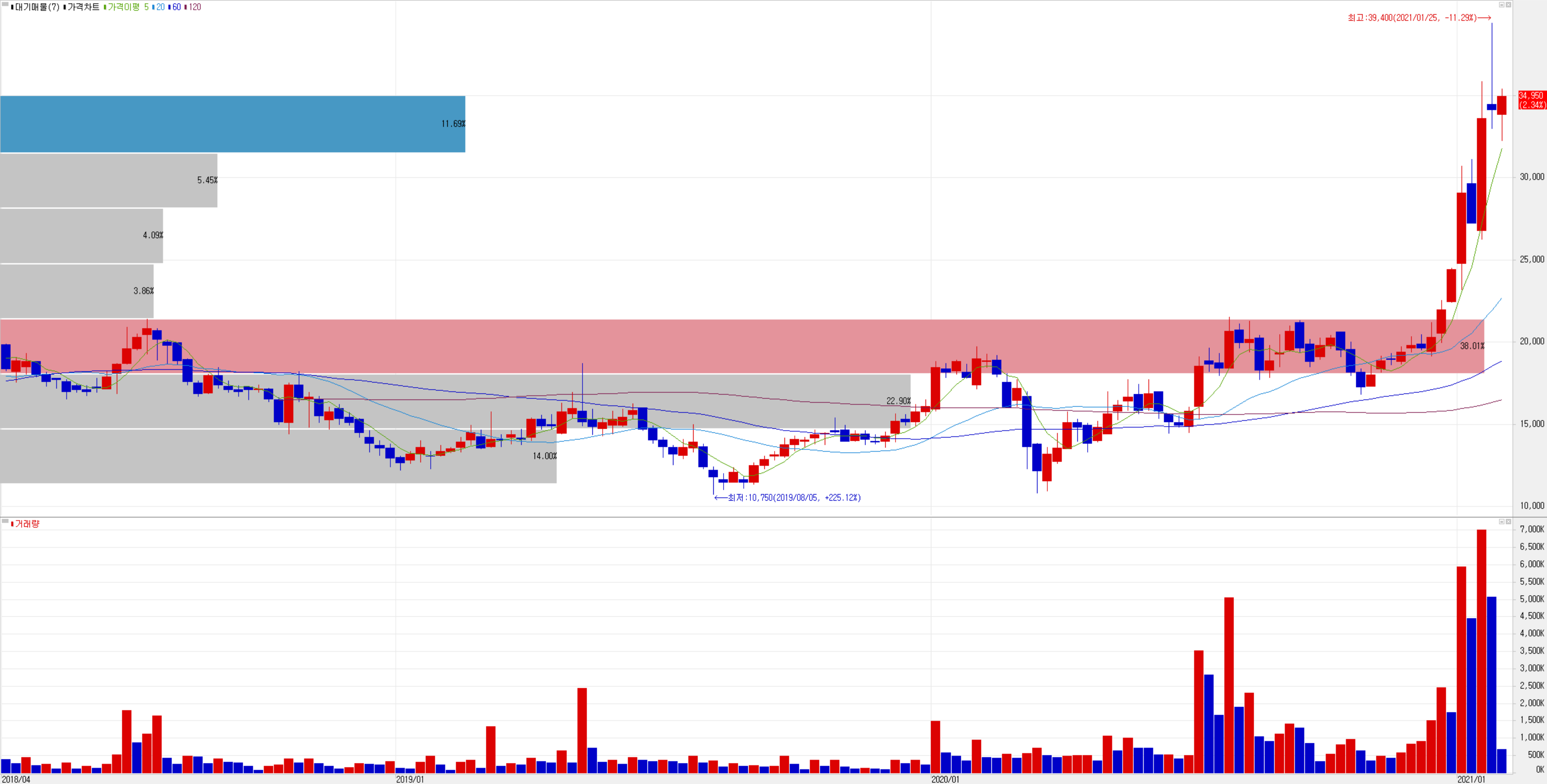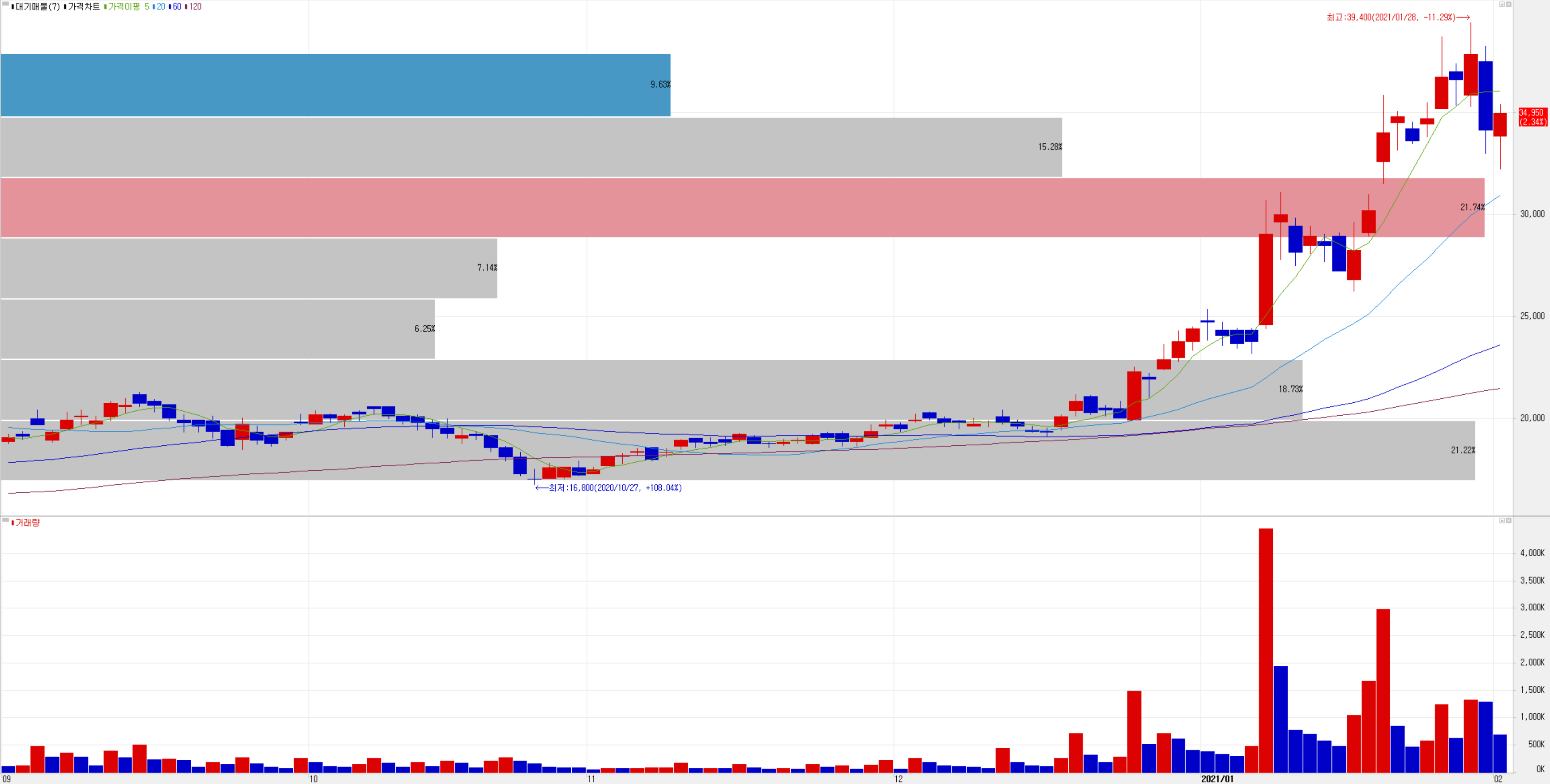 2월 1일 기준 일봉 차트입니다. 최근 시장의 조정이 있었으나 비교적 낙폭이 크지 않은 상태에서 지난주를 보내고 오늘은 소폭 반등했습니다. 추가 하락 시 아래로는 20일선을(31,000원) 지지하는지 확인하고 상방은 어느 정도 열려있는 상태로 보고 있습니다. 다만, 시장의 변동성이 심한 구간이고 1월 초에 개인적으로 설정한 목표가인 33,400원을 달성하였기에 매도 후 관망하는 종목입니다.