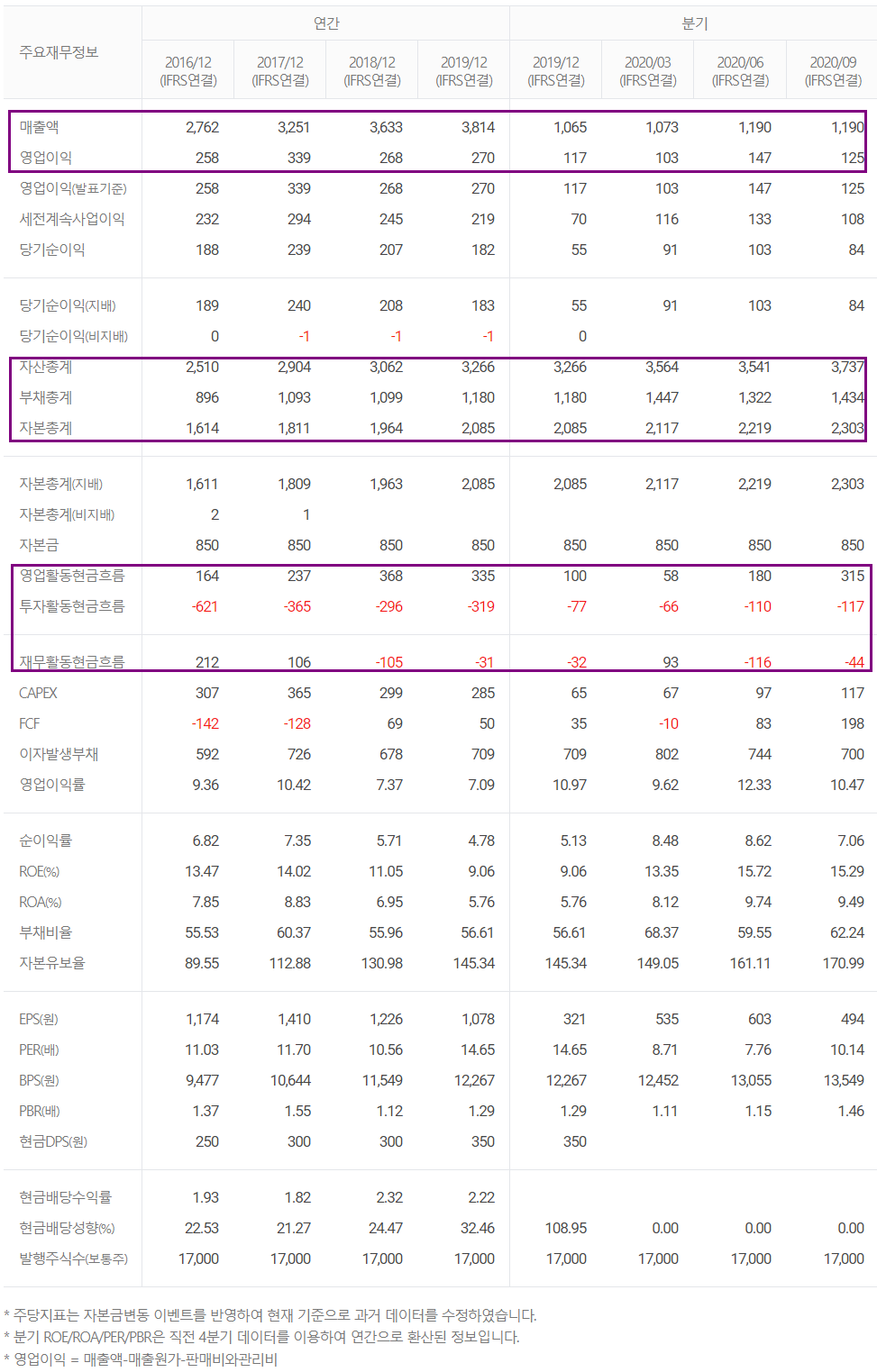 당사의 2020년 3분기 누적 기준 매출액은 3453억 원으로 저년 동기 대비 25.6% 증가했고, 영업이익은 374억 원으로 144% 증가했습니다. 서버용 DRAM 수요가 큰 폭으로 증가하면서 패키징 기판 매출 및 자동차 전장용 리드 프레임 매출의 회복이 견조한 실적을 보여 준 것 같습니다.