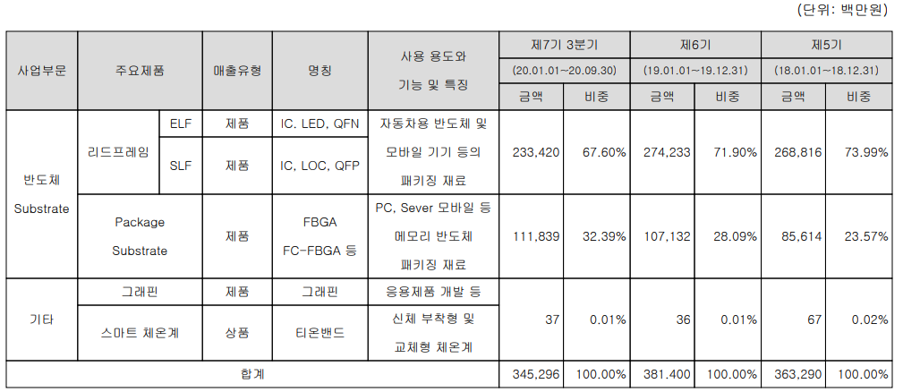 2020년 3분기 기준 리드 프레임의 매출은 2334억 원으로 전체 매출의 67.60%를 차지하고 있으며, PKG Substrate 가 1118억 원으로 32.39%의 매출 비중을 보이고 있습니다. 신규 사업은 그래핀과 스마트 체온계 등의 매출은 아직 미미하지만 미래가 기대되는 시장입니다.