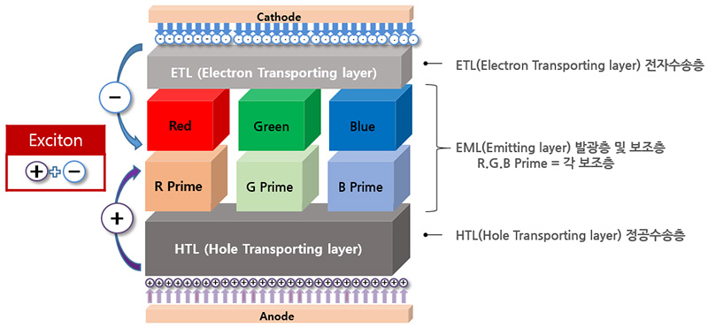 위 그림에서와 같이 전계를 가하면 음극(Cathode)에서는 전자가, 양극(Anode)에서는 정공이 주입되면서 발광층(EML)에서 만나게 됩니다. 이때 전자와 정공의 결합체를 여기자(Exciton)라고 하는데, 여기자란 원자, 분자 등에 에너지를 부여하여 고에너지 상태로 만드는 것으로써, 여기자 상태에서는 일시적 불안정한 상태이기 때문에 안정 상태로 돌아가려는 현상이 발생하여 에너지를 방출합니다. 이 상태를 '기저 상태'라고 하며, 이때 방출되는 에너지가 빛의 형태로 바뀌면서 인식됩니다.