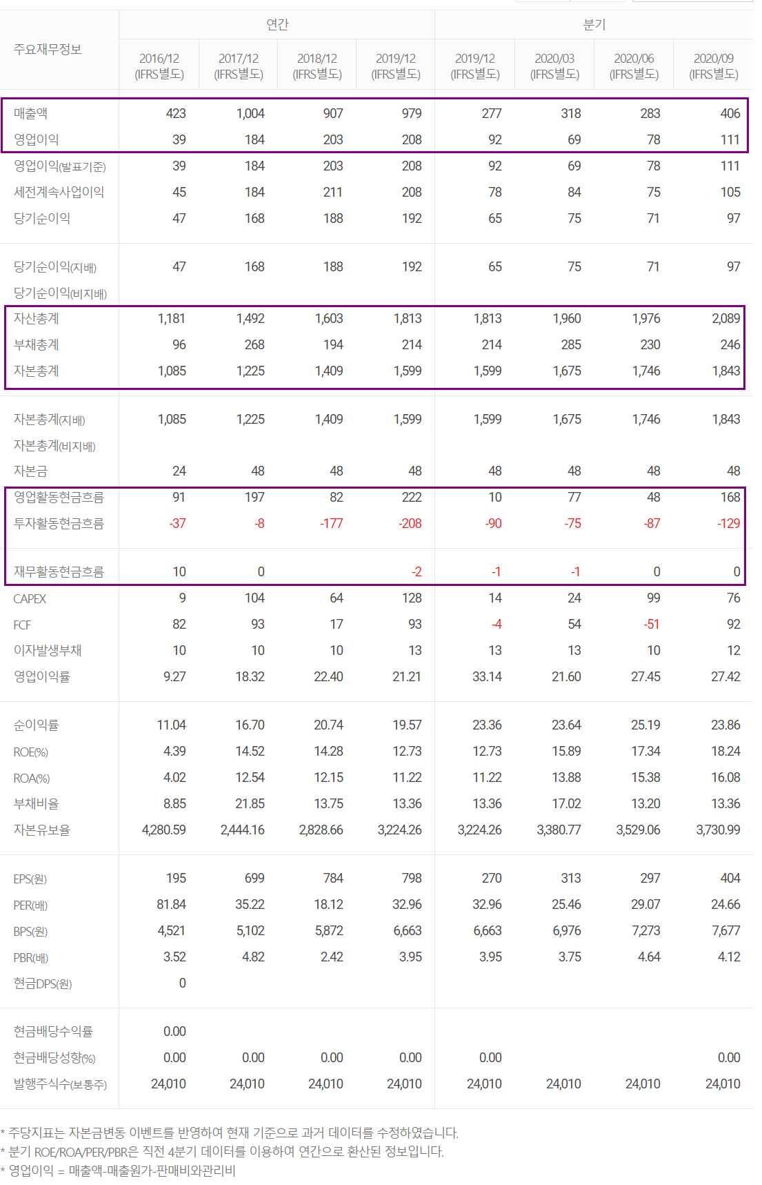 당사의 2020년 3분기 누적 기준 매출액은 1,007억 원으로 전년 동기 대비 43.6% 증가했고, 영업이익은 258억 원을 기록하면서 123% 증가했습니다. 전반적으로 수익성이 개선되면서 큰 폭의 이익률 개선이 보입니다.