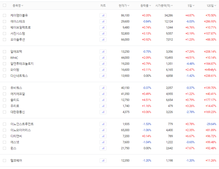 국내 5G 관련주들에 대한 밸류체인입니다.