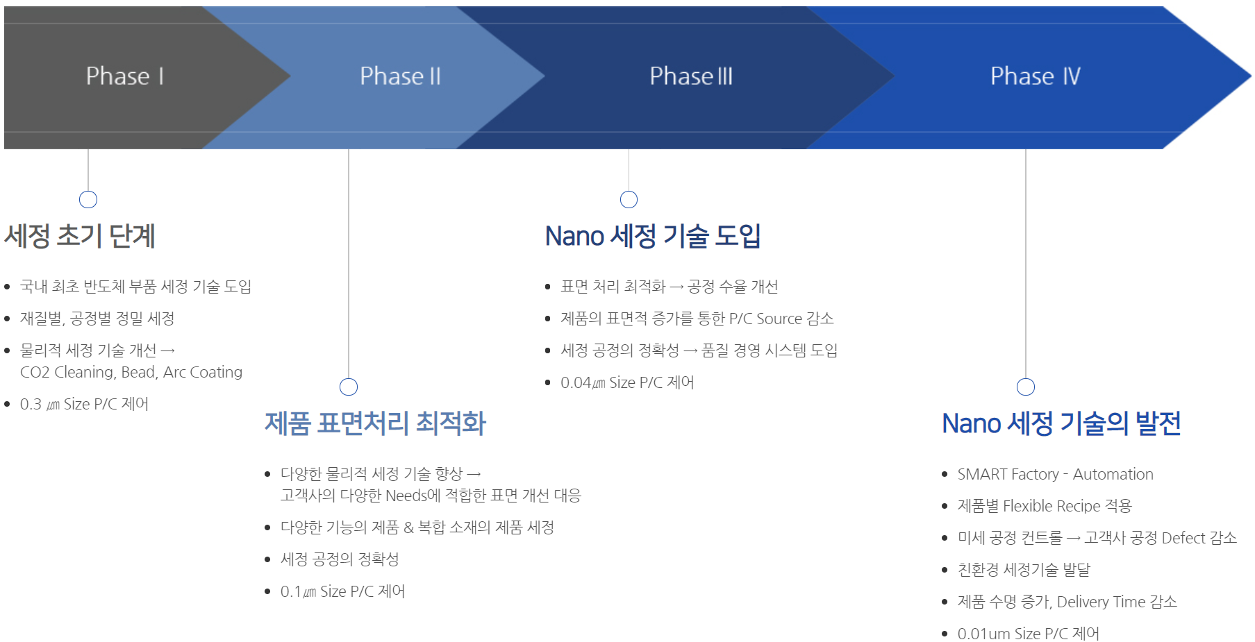 당사는 1996년 국내 최초로 세정 기술을 개발할 당시에는 물리적 세정 기술 기반의 각 공정 별, 부품의 재질 별 정밀 세정 솔루션을 제공하였으나 지속적인 연구 개발로 최근에는 나노 세정 기술, 미세 오염 제어를 통한 제품의 수명 증가와 생산성 향상에 대한 다양한 솔루션을 제공하고 있습니다.