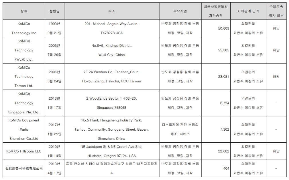 당사의 최대 주주는 세라믹 파우더, 정전척, SOFC를 전문으로 하는 (주)미코 로써, 물적 분할을 통한 분사를 하여 미코는 소재 및 재료, 코미코는 소재 재료를 기반으로 한 세정 및 코팅에 특화된 전문성을 가지고 시너지 효과를 기대할 수 있겠습니다. 당사의 종속기업에는 미국, 중국, 대만 및 싱가포르 등 글로벌 반도체 기업들이 위치한 지역에 네트워크를 구축하고 있습니다.