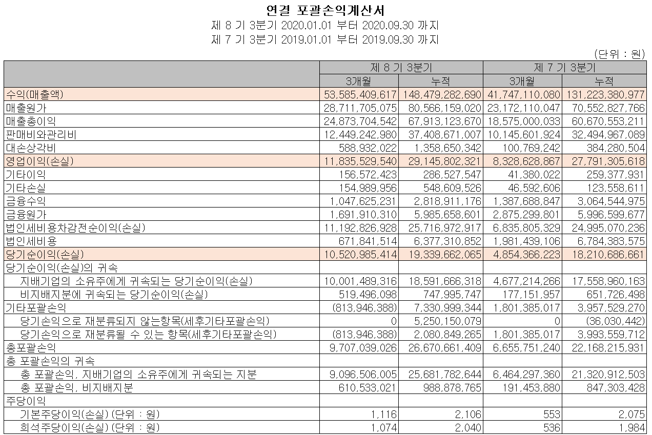 당사의 2020년 3분기 누적 기준 매출액은 1485억 원으로 전년 동기 대비 13.2% 증가했고, 영업이익은 291억 원으로 4.9% 증가했습니다.